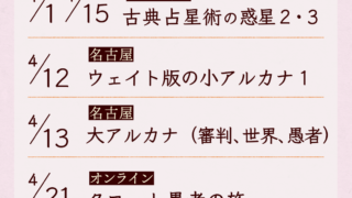 テレーマではオンラインで古典占星術(惑星)とタロット「愚者の旅」、リアル名古屋でタロットの小アルカナ講座と大アルカナ講座があります。他の教室さんのも分かる範囲で載せてます